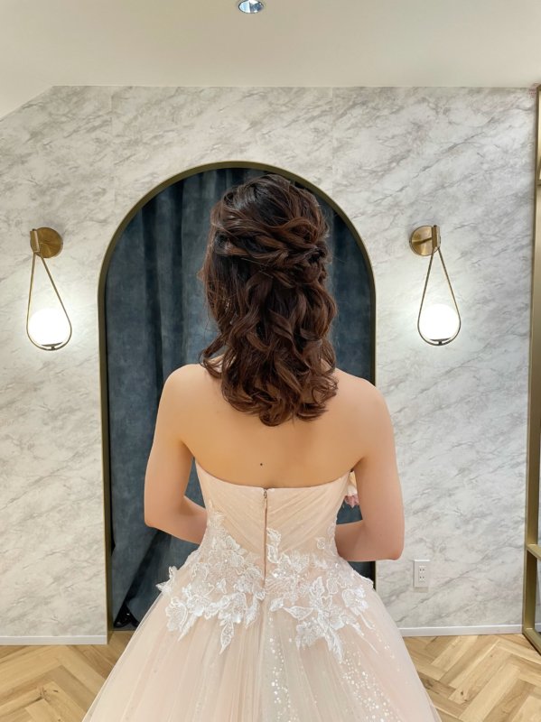 今回ヘアスタイルはドレスの可愛らしい雰囲気に合わせて王道なハーフアップに仕上げました。