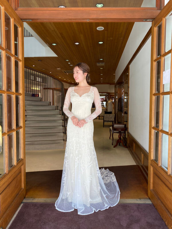 実際にご試着いただくと、クレアペティボーンならではの優雅で上品なシルエットを体験できます。