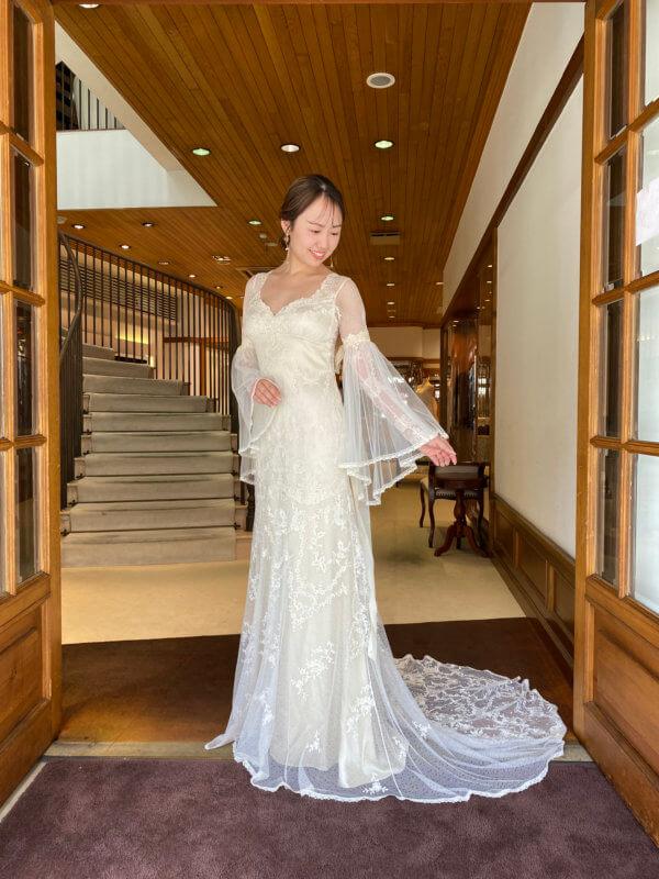フレアスリーブは取り外しが出来る2WAY仕様なので、挙式と披露宴などシーンごとに雰囲気を変えたい花嫁様にオススメ。