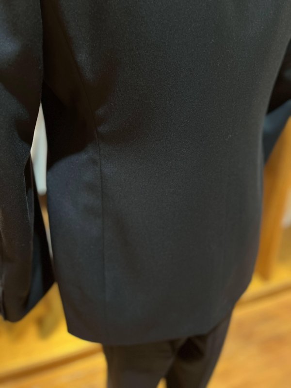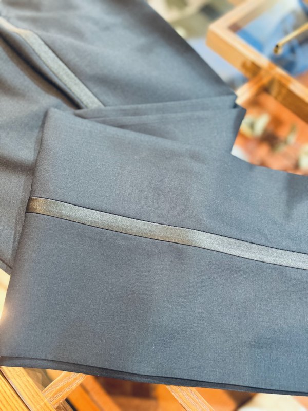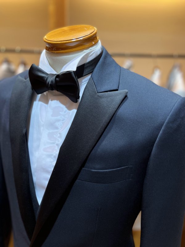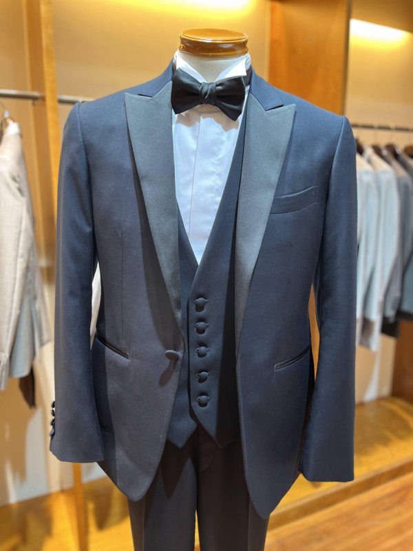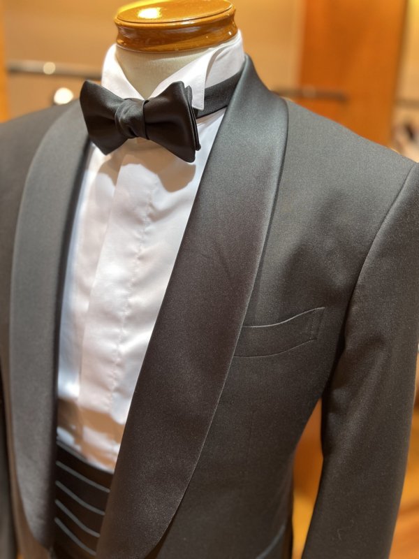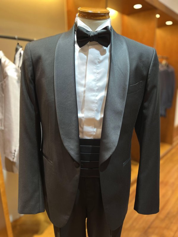拝絹と呼ばれる光沢のある襟と、パンツのサイドに入った側章や、ノーベントと呼ばれるバックに切り込みのない使用は正式なフォーマルウェアに使われ、タキシードの王道スタイルです。