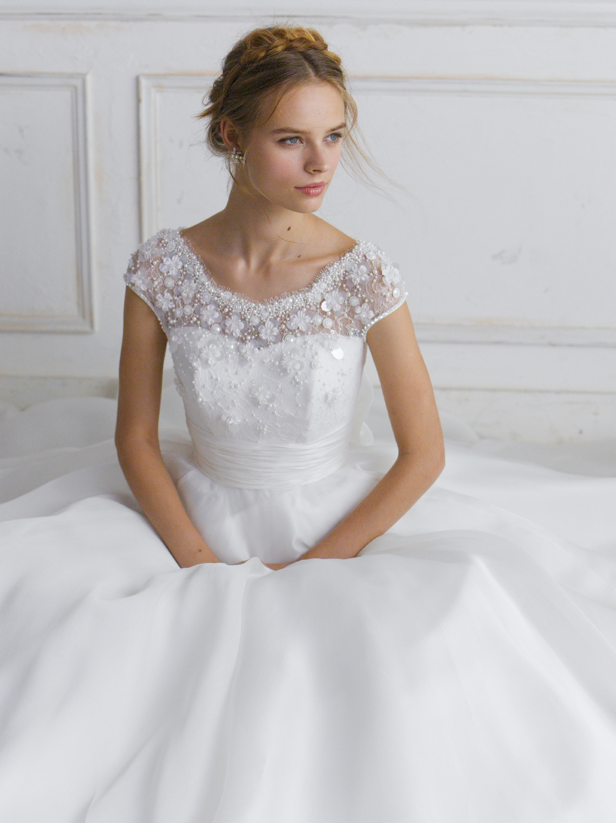 デコルテ部分にあしらわれたパールやお花のビージングがとても可憐な印象のウェデイングドレスです。
