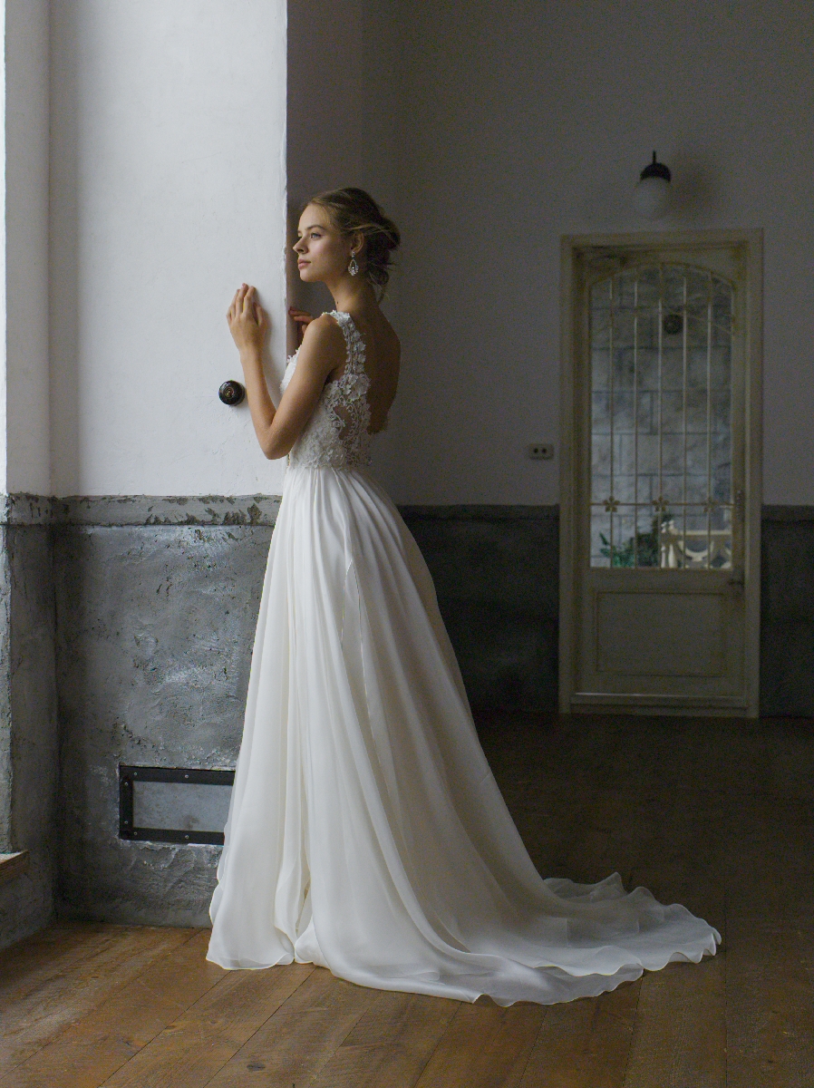 柔らかなシルクオーガンジーのスカートが動くたびに揺らめき、新婦様の透明感を引き立たせてくれる1着です。