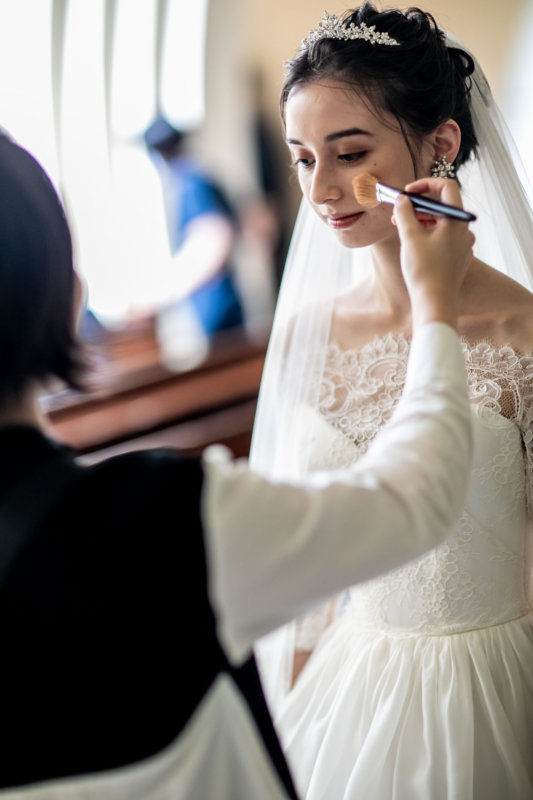 ブランドゥスティルアンのヘアメイクリハーサルは、ご自身が選んだドレスを着た状態で、当日さながらに仕上げていきます。