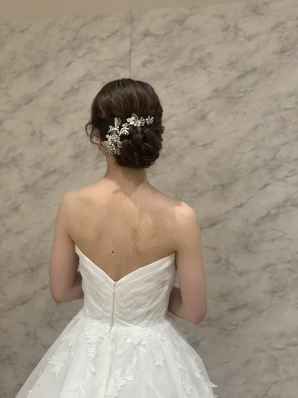 先程の<王道シニヨン>のトップのデザインは変えずに、毛先のみを崩して巻き下ろしに。