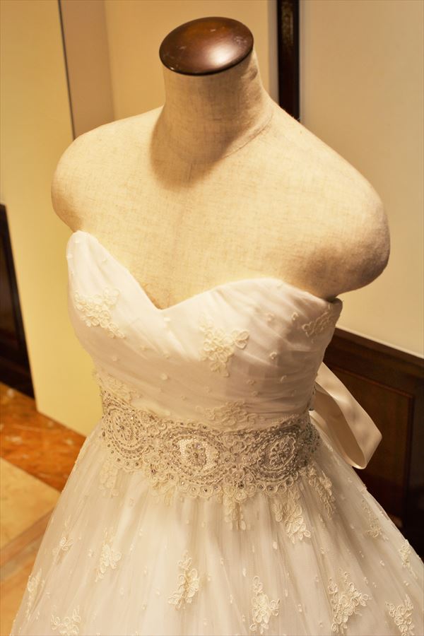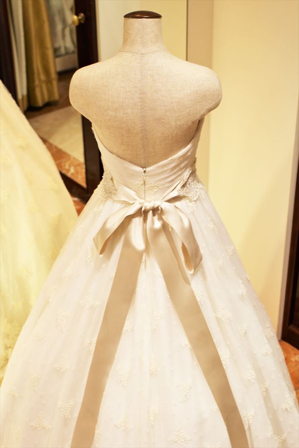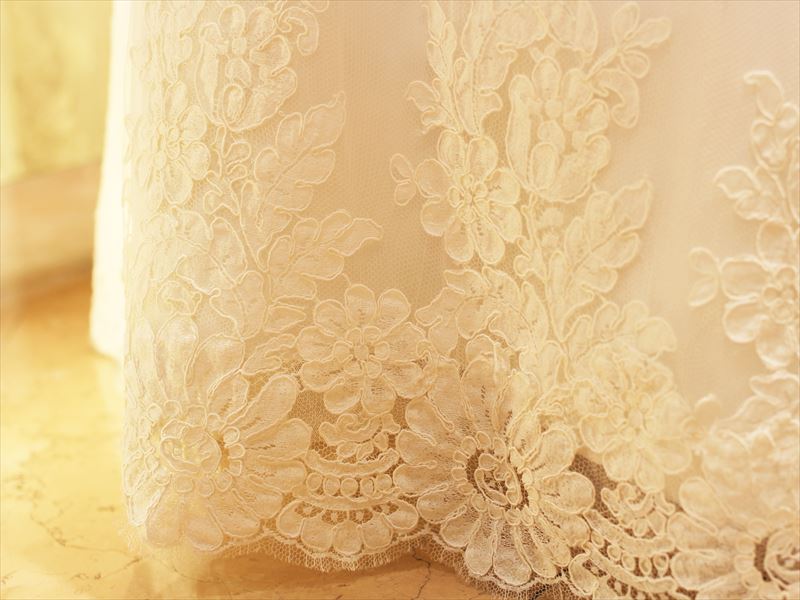 土台の生地が透けて見える総レースのドレスは、土台となる中の生地と上に重ねられるレースとの微妙な色使いのニュアンスが美しさを左右します。