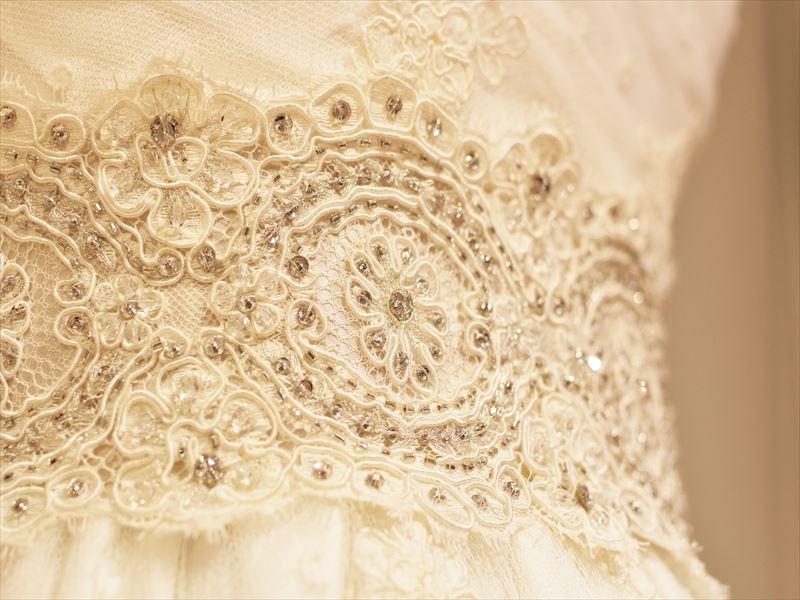 レースにあしらわれたクリスタルビーズやビジューの細やかなビーディングが繊細な輝きを放ち、誰もが目を奪われます。
