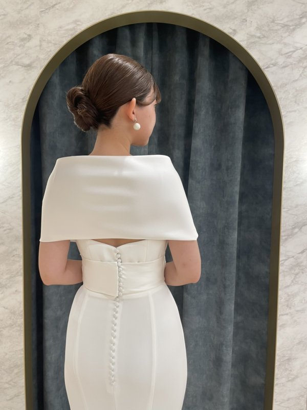 とろみのあるクレープ素材が花嫁様の身体にフィットし、よりボディラインを綺麗に美しく魅せてくれる一着。