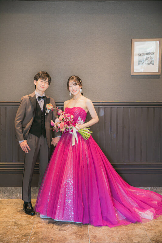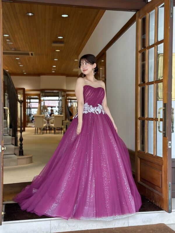 大小さまざまなスパンコールがキラキラと輝く華やかなお衣裳ですので、照明が当たる披露宴会場やシックな会場との相性も良く、またプラムカラーが新婦様のお肌移りをより綺麗に見せてくれます。