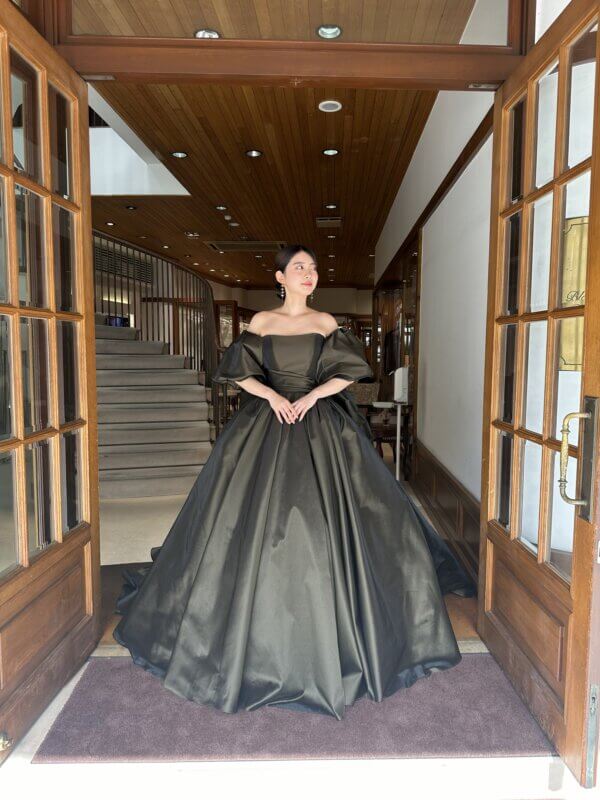 ドレスのデザイン、カラー共に支持をいただいていたカメリアをカーキカラーで仕立てた一着です。落ち着きのあるダークカラーは近年の流行色でもあり、特にカーキは沈み過ぎないお色味と大人可愛い雰囲気を演出してくれます。