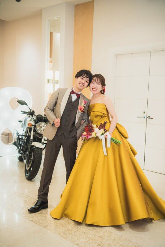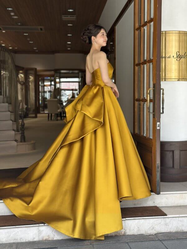 ドレスらしく華やかに映えるイエローカラーですが、ビビット過ぎないマスタードの絶妙なカラーリングが人気をいただきました。