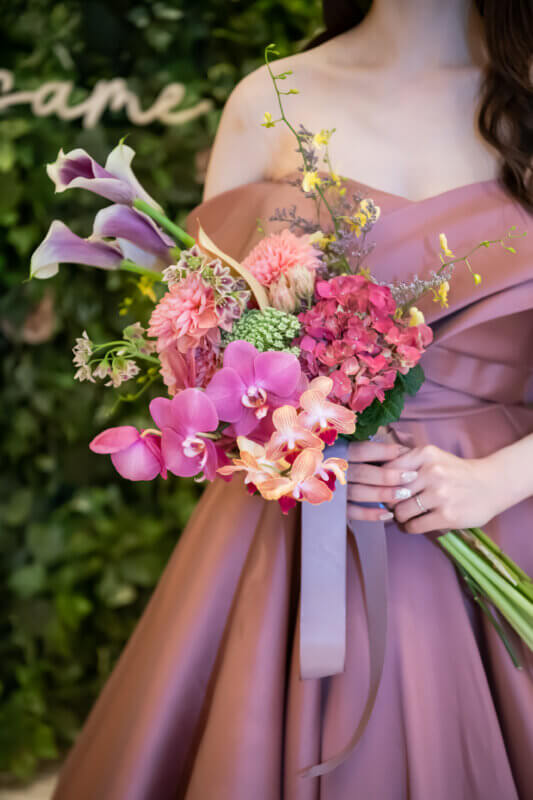 ブーケには、明るめのピンクやラベンダー、蘭やダリアなど動きのあるお花を組み合わせて。