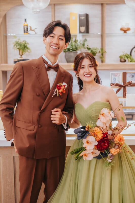 新郎様はブラウンのダブルジャケットで季節感を演出。