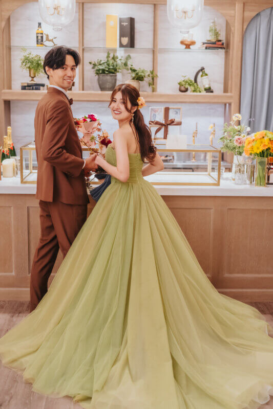 秋冬の装いにおすすめなのは、淡いニュアンスカラーのグリーンのドレス。