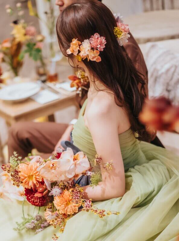 ヘアはまとめすぎず、ほどよくルーズなスタイルにブーケに合わせた小花を散りばめて、さりげない華やかさをプラス。