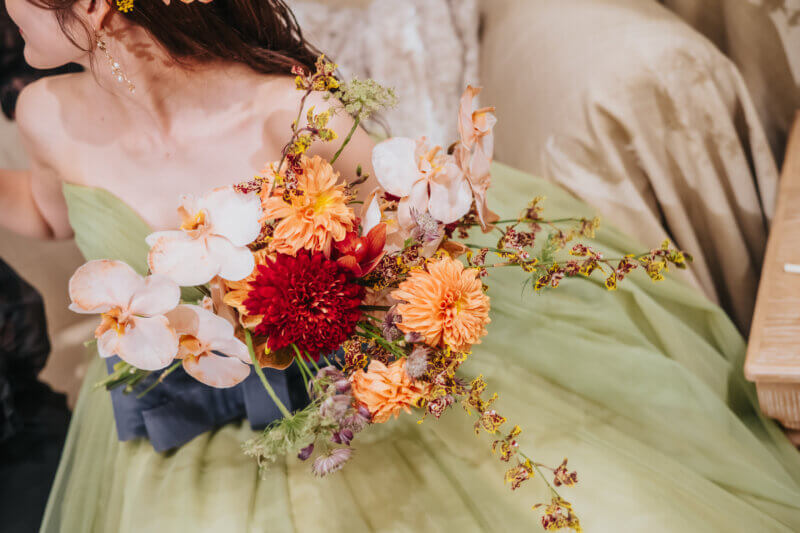 ブーケは、赤やオレンジ、胡蝶蘭などをアクセントにしたボリューム感のあるデザインで、秋らしいクラシカルな印象に。
