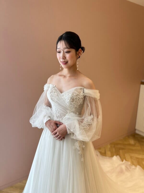 甘くなりすぎてしまうのが心配な花嫁様はお袖を外した状態で着ていただくのも。