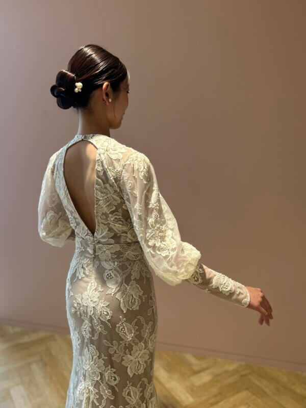 バルーンスリーブのお袖や、大胆な胸元・お背中のカットも印象的で、