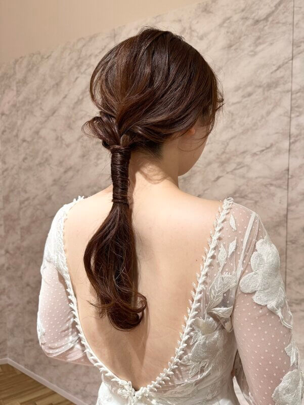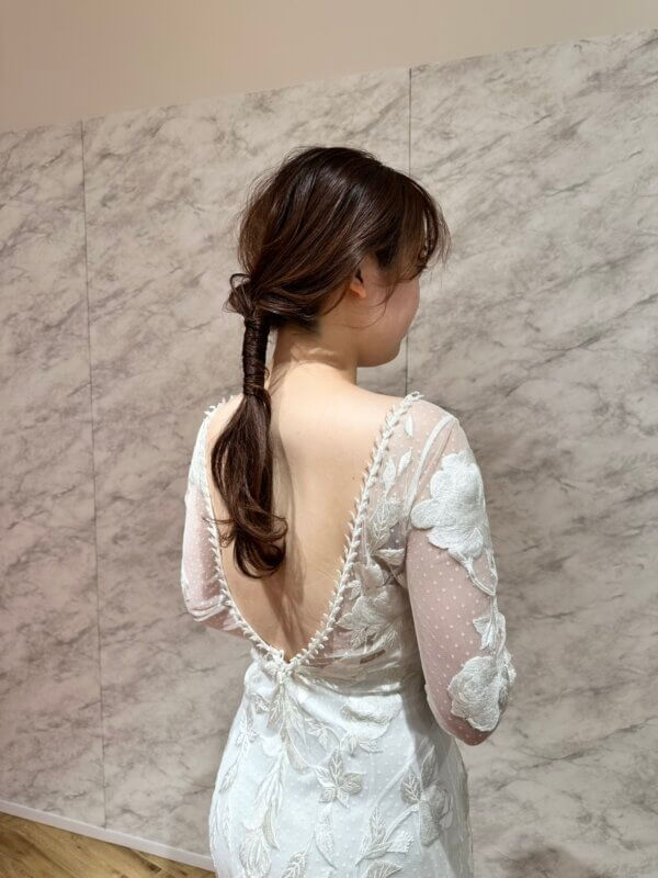 こちらのヘアスタイルは、お体に沿ったナチュラルなシルエットのドレスをお召しの花嫁様におすすめです。