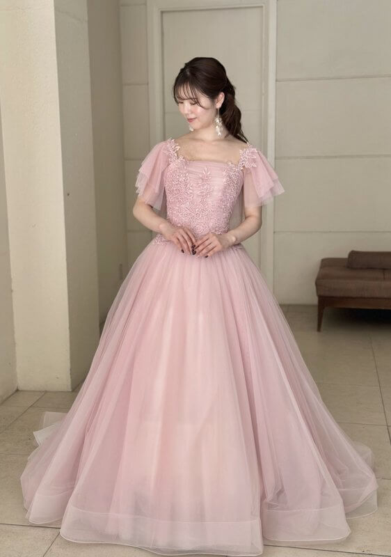 柔らかなピンクのチュールでフェミニンな印象を纏う、トレンド感たっぷりの1着です。