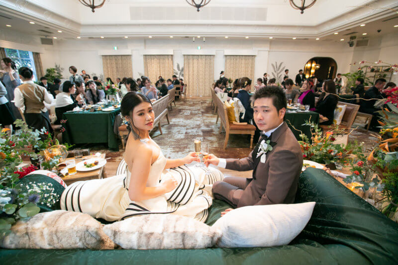 ゲストの皆様からの温かい祝福の声とフラワーシャワーをくぐりぬけたら、「和装」へとお色直しです。