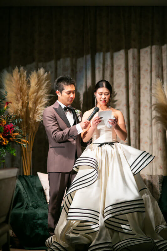 ご新郎様は、挙式とは雰囲気を変えブラウンのタキシードを着用いただきました。