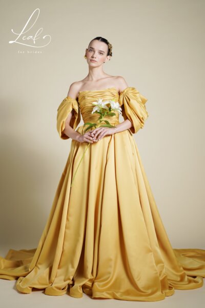 繊細なギャザーを施したショルダーが、柔らかくも存在感のあるシルエットを描きます。
