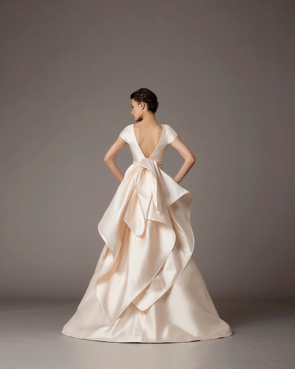 胸元の露出を控えた上品な印象は、ホテルウェディングやレストランウエディングにもおすすめです。