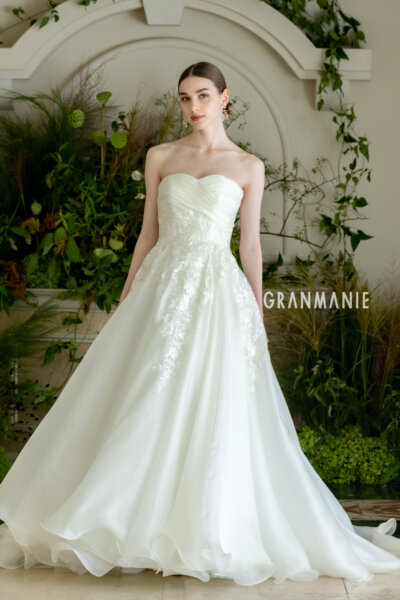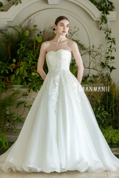 胸元に施されたドレープが柔らかな立体感を生み、上質な華やかさ漂うドレスに。