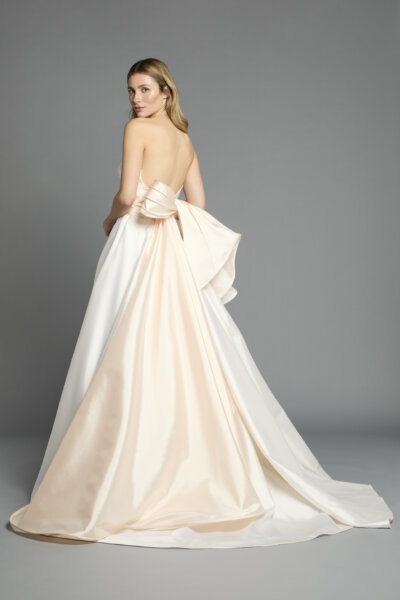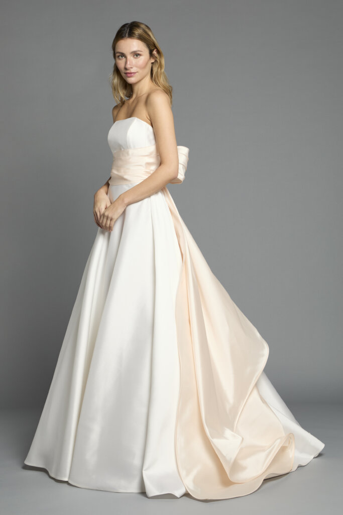 背面へと続くラインはリボンとして結ばれ、後ろ姿にさりげないアクセントを添えます。