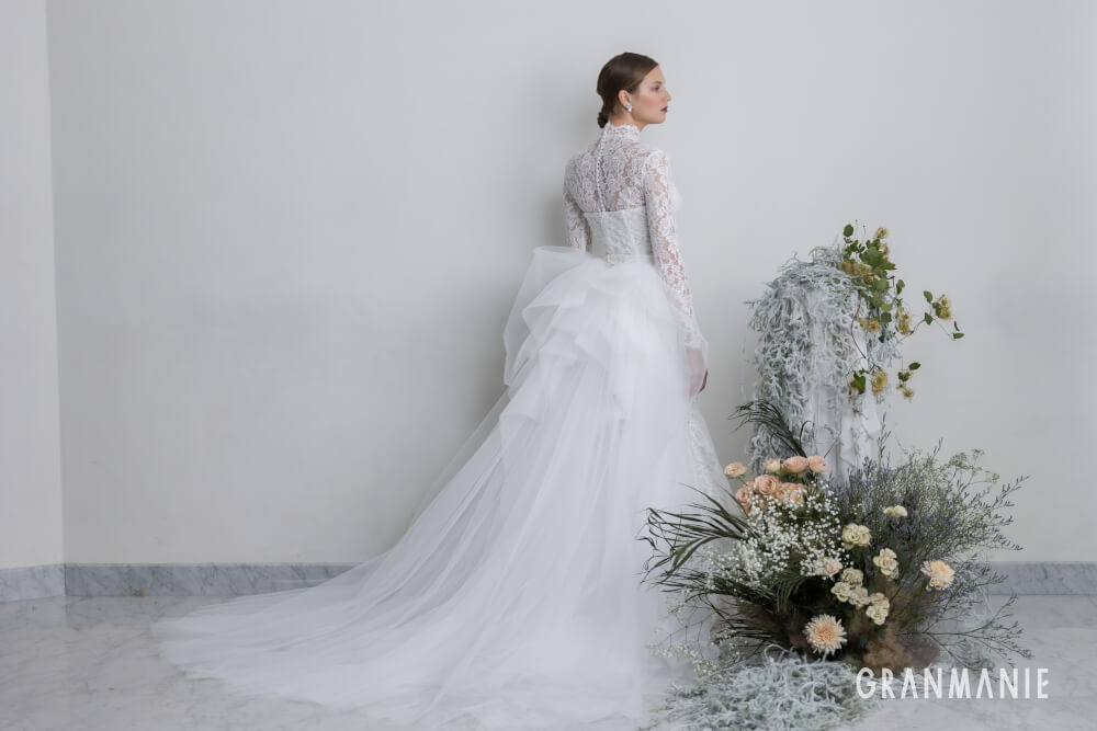 高い位置から裾が広がるマーメイドラインは女性らしいしなやかな曲線美を表現したエレガントなドレス。